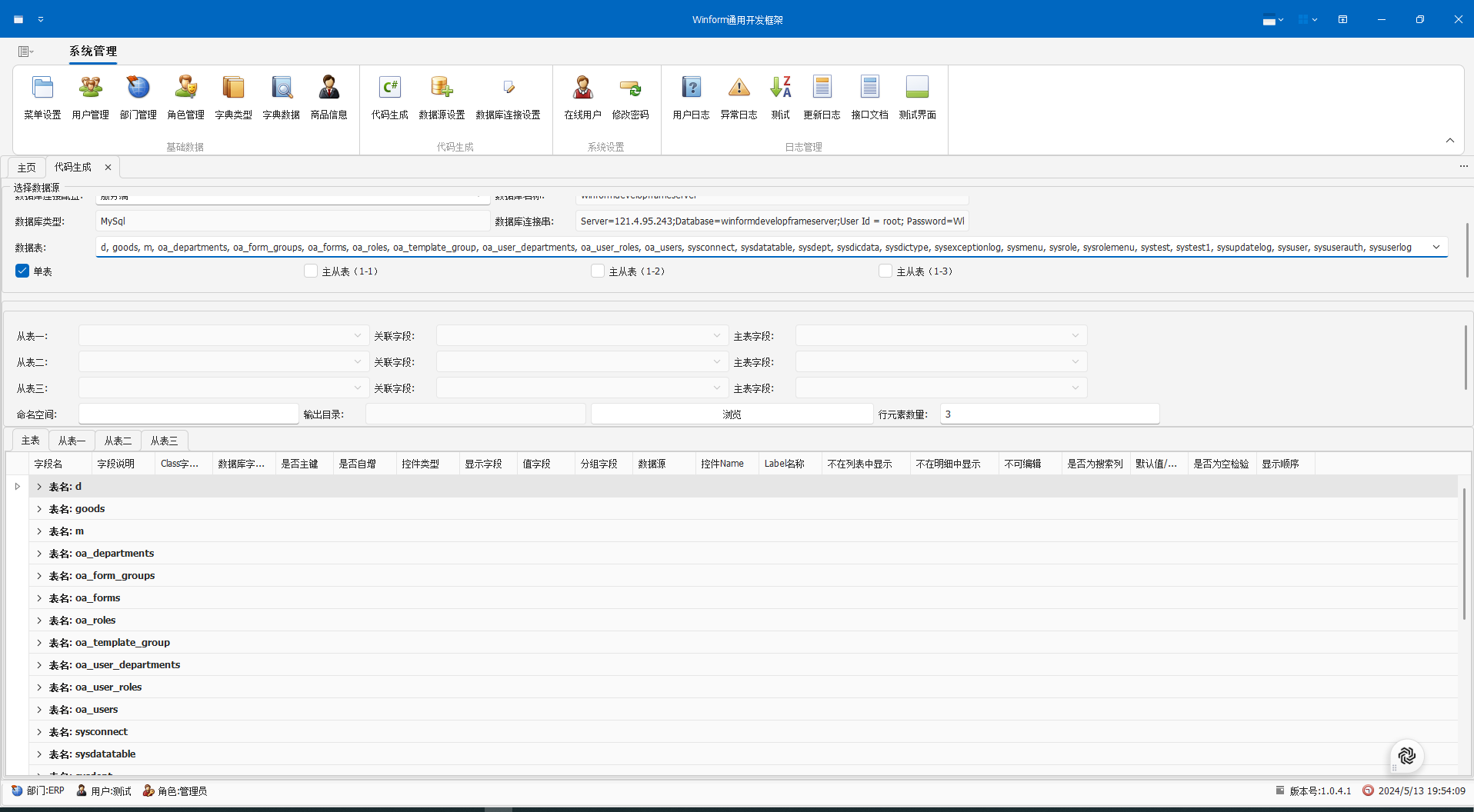 winform通用开发框架是一个简单实用的二次开发框架。内置完整的权限架构包括菜单、角色、用户、字典、日志、代码生成等一系列系统常规模块。为了一般管理系统避免重复造轮子不需要在关注权限 页面等新增功能只需要新增form界面并完成自己的业务在系统配置即可。